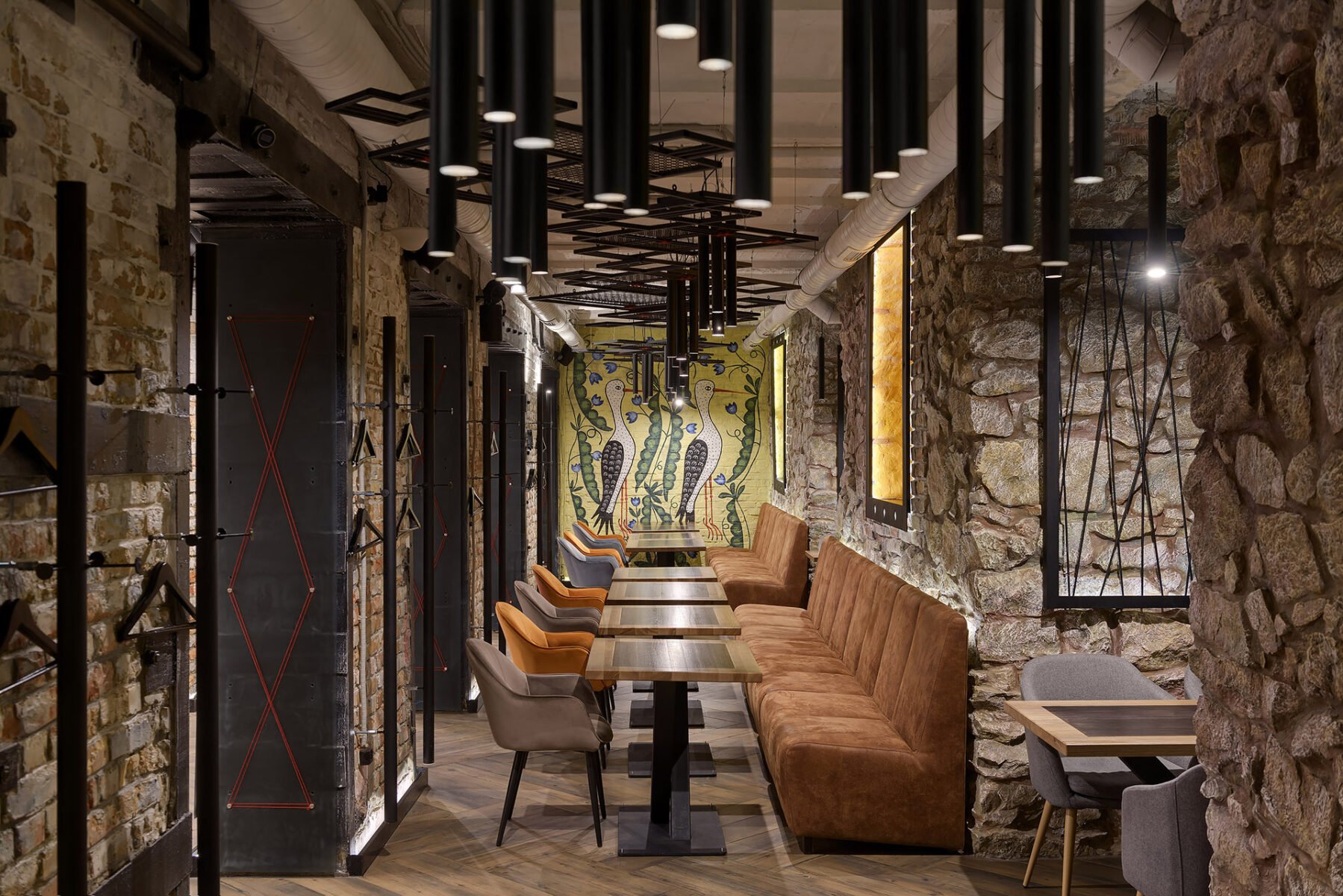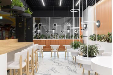 Незвичне розташування зелені у столах дозволило нам додати природничі елементи без втрати простору у залі