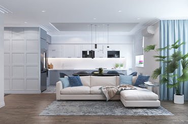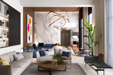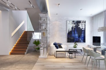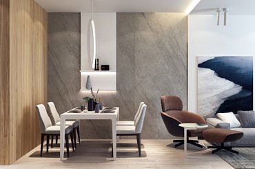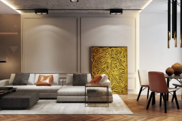 Основним побажанням власника було створення квартири вишуканої та продуманої. Для цього ми використовували м’яку кольорову гаму, меблі та світлові прилади від світових лідерів індустрії, а також поєднання таких елементів, як тонкі тонкі молдинги на стінах (забарвлені в колір стін), на контрасті з рудими м’якими шкіряними кріслами. Усе це становило єдину витончену неокласичну композицію.