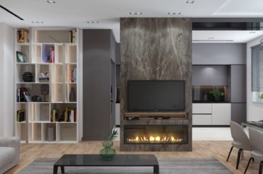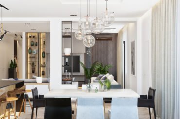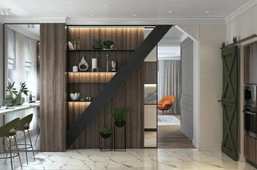 Несуча колона та стяжка на кухні спочатку розділяли вітальню зону та кухню. Нам вдалося успішно їх обіграти та візуально розширити простір за рахунок дзеркальної перегородки з боку їдальні. З боку кухні ми виділили форму в графітно-чорний колір із задньою стінкою зі шпону і перетворили колону на полиці з ефектом спроектованого об’єкта.